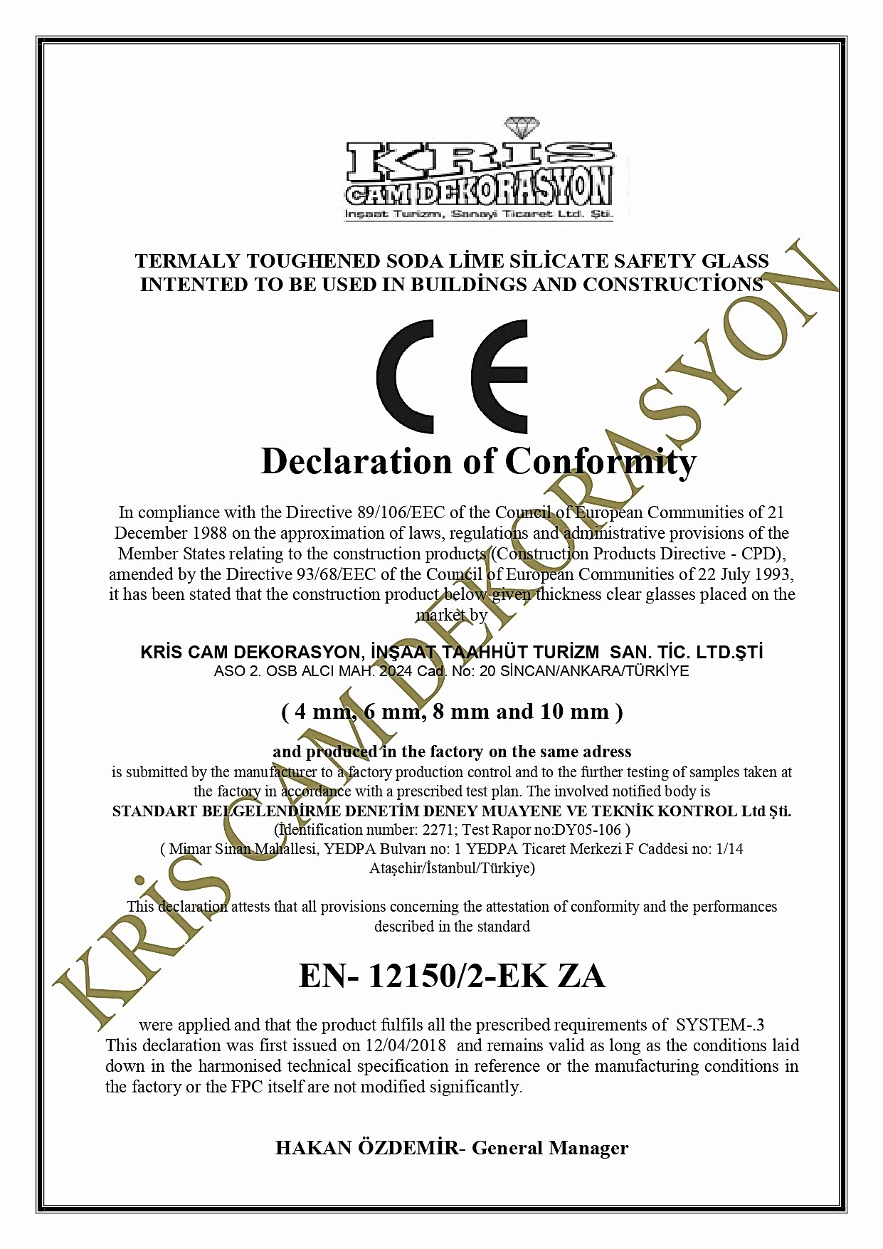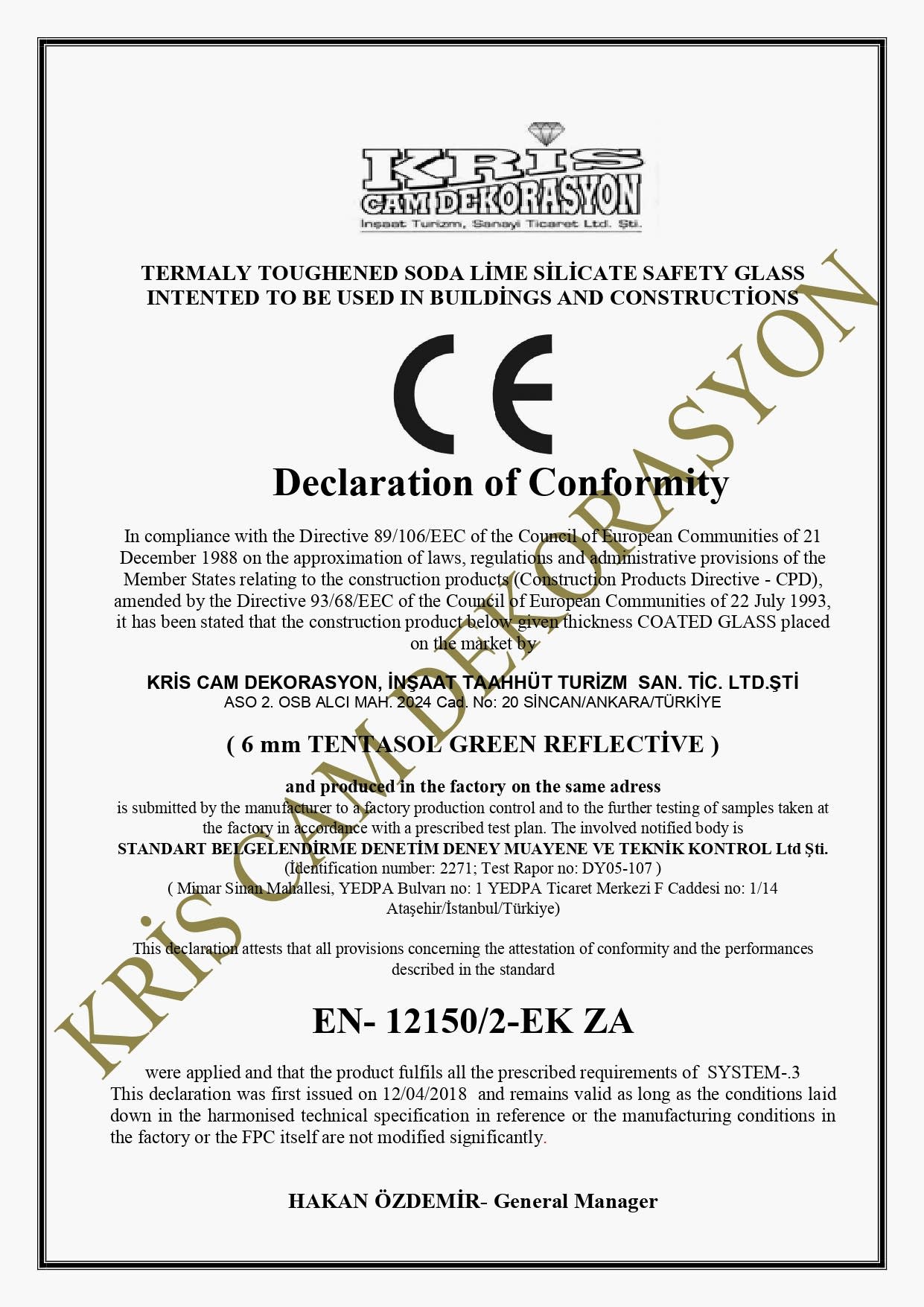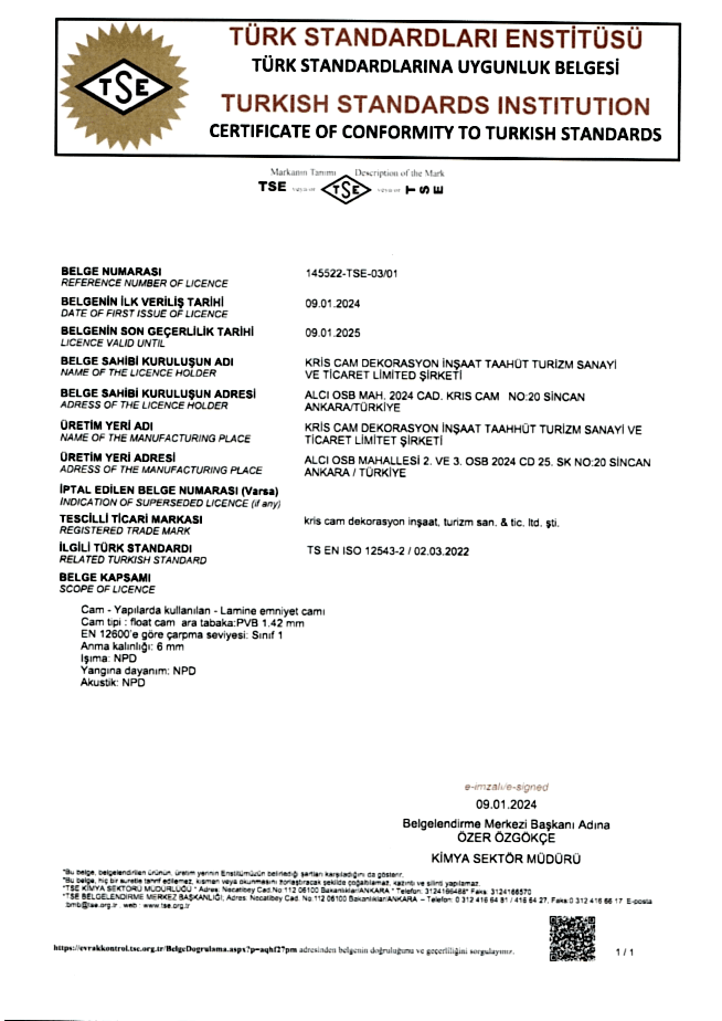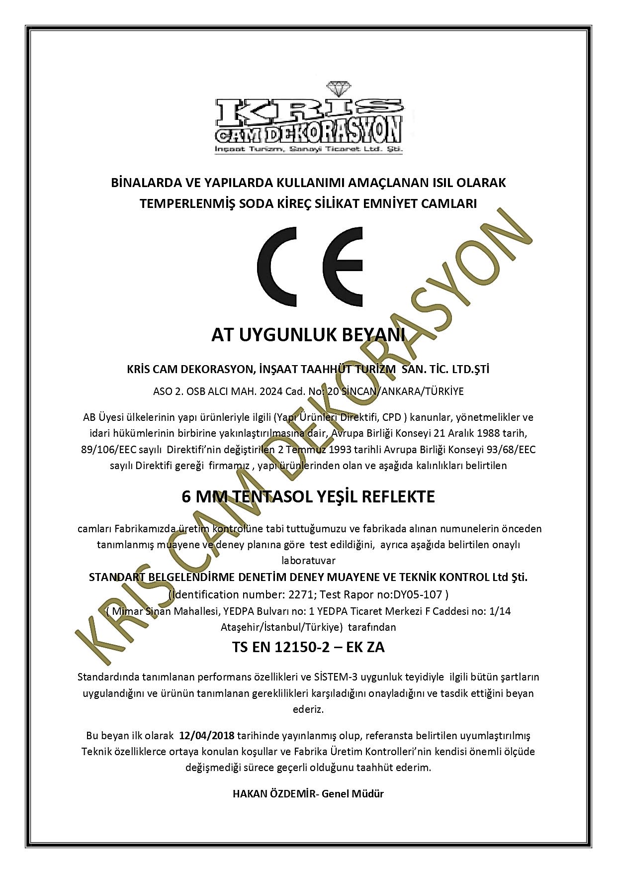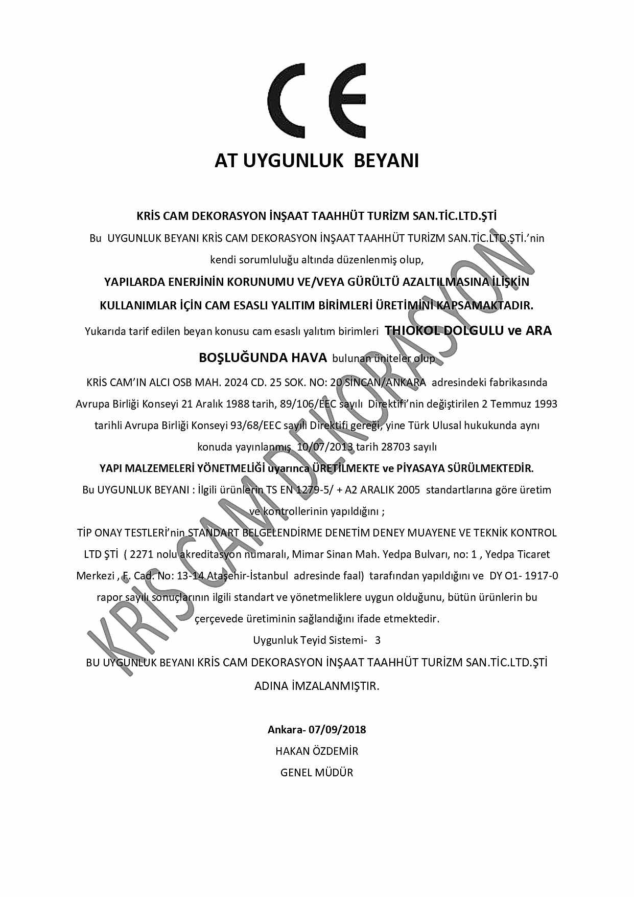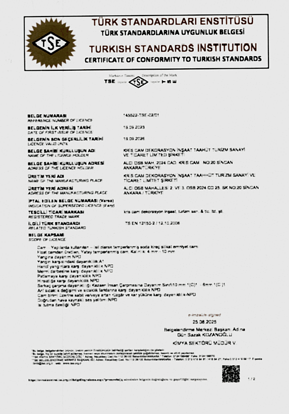 Temperli Cam AT Uygunluk Beyanı - Kaplamalı Cam