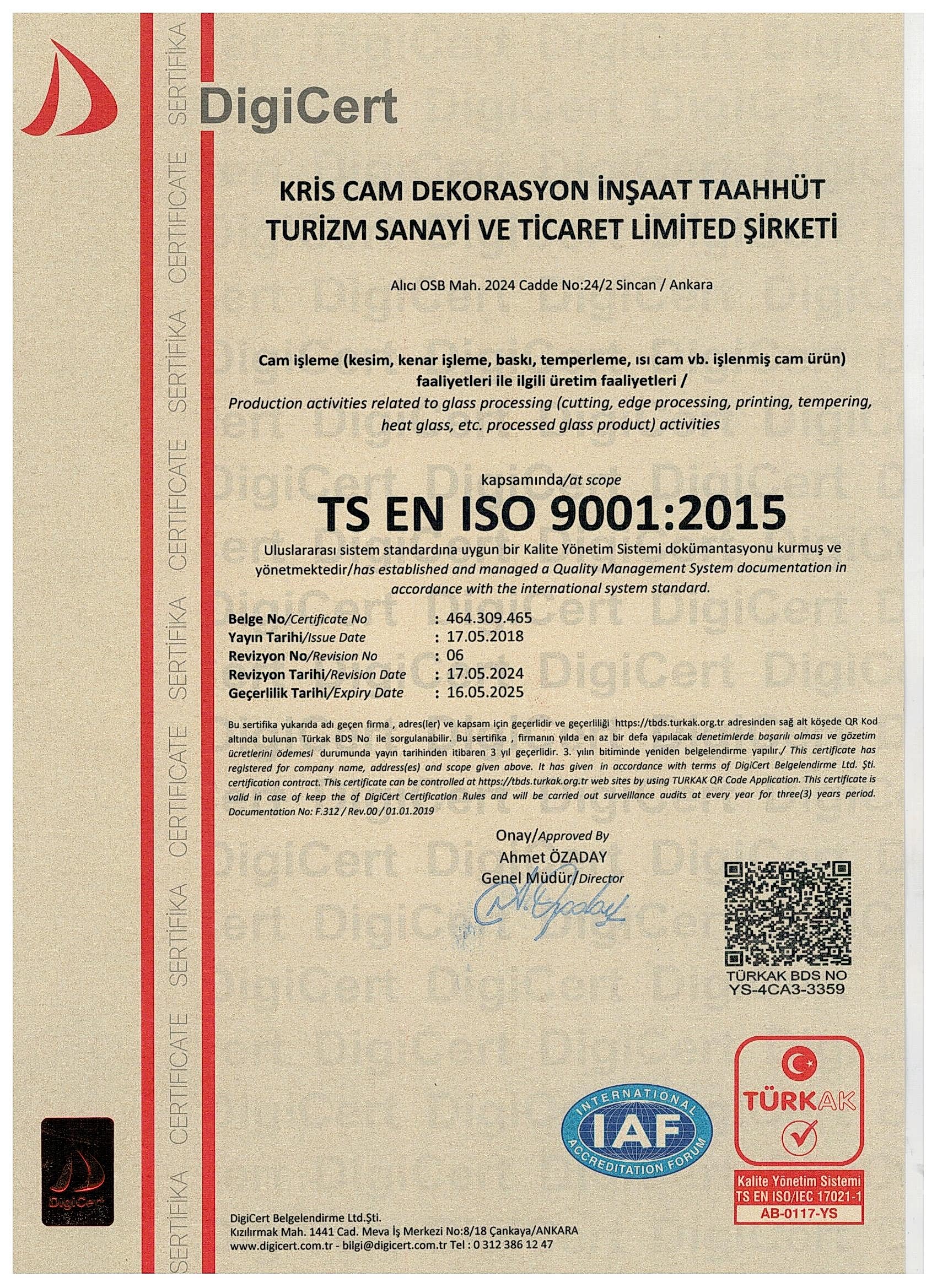 ISO 9001 Kalite Yönetim Sistemi Belgesi